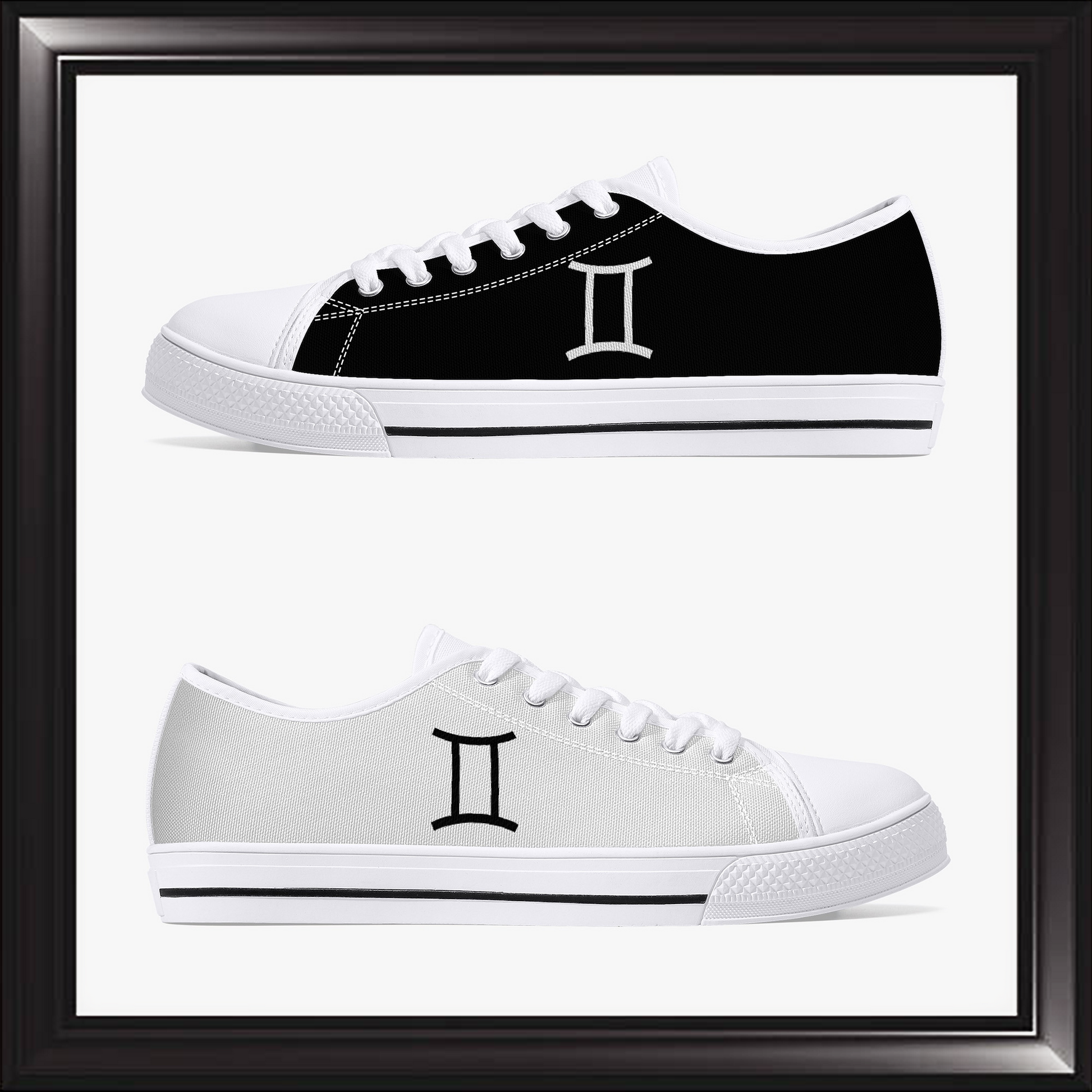 Gemini, an Air sign ruled by Mercury, thrives on mental agility, curiosity, and communication, effortlessly shifting between ideas, interests, and social circles with lively energy. Known for their wit, versatility, and gift for conversation, Geminis bring excitement and connection to any interaction, often excelling in roles requiring quick thinking and adaptability. While their dual nature fuels creativity and learning, it can sometimes lead to scattered focus, inconsistency, or difficulty committing deeply when novelty wears off. The Gemini Sneaker is a classic beautiful low top canvas shoe. Perfect for all occasions and designed for Unisex.