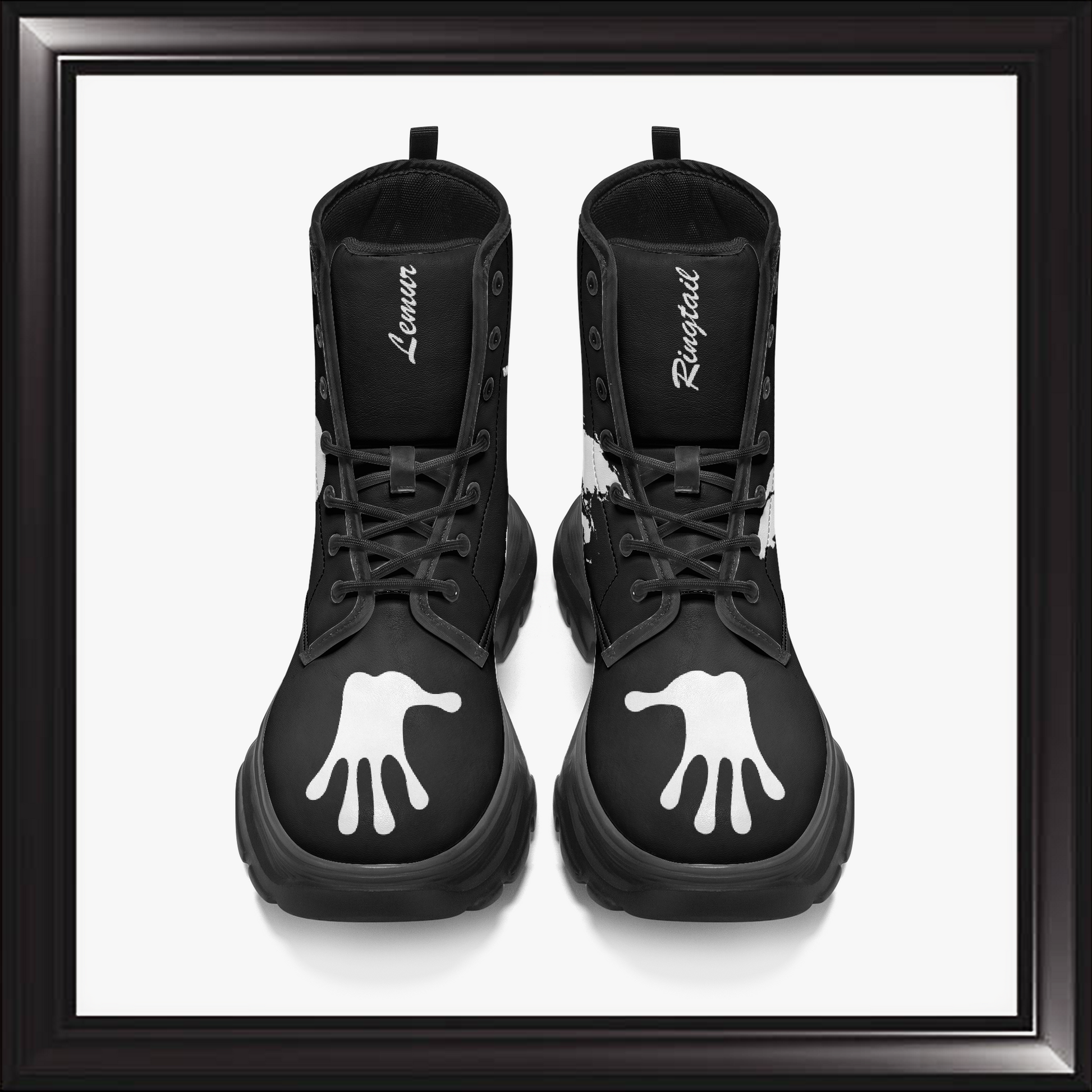 Step into the wild with our Spirit Animal Collection, where nature’s most iconic creatures meet urban style. Introducing the Ringtailed Lemur Boot - a lively homage to curiosity, balance, and community - crafted for those who move with intention and embrace their playful side. Each boot features a striking black, white, and earthy-toned design, with a unique artistic and educational scene on each side. One side captures the lemur leaping through the canopy, symbolizing agility, freedom, and wonder. The other side reflects its tight-knit social world - a vibrant baobab tree scene representing connection, resilience, and spirited exploration.